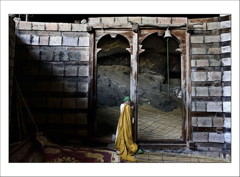 In the monastery of Yemrehanna Kristos. A praying woman inside the courtyard of the Monastery hollowed inside the cave. The whole construction is based on Olive tree wooden panels used to uplift it from the watery terrain underneath it. Legend has it that the difficulty in finding the churches is due to a Muslim queen who wanted to eradicate Christianity from Ethiopia, burning all the churches she could find.